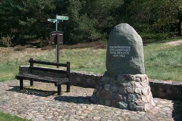 stürzte er am 9. August 1896 an der Nordostseite des Gollenbergs aus 15 m Höhe ab und verstarb an den Folgen des tragischen Unfalls. Ein Denkmal an der Absturzstelle erinnert seit 1952 an den mutigen Erfinder, der durch seine Forschung das erste gesicherte Wissen über das Fliegen vermittelte. |