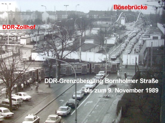 ![]() (gescanntes Fremd-Foto) DDR-Grenzübergang Bornholmer Straße auf der "Bösebrücke". ![]() Ausreiserückstau der Pkws von "DDR-Gästen" - vor dem Mauerfall in Pankow, an der DDR-Grenze von Ost- nach West-Berlin (Wedding). Die Straßenbahn musste damals noch kurz vor der Grenzmauer die Bornholmer Straße in Ost-Berlin verlassen und kreuzte dabei den Rückstau der Autos. (gescanntes Fremd-Foto) ***************************************************************************************************************************** Was die erste Revolution am 17. Juni 1953 in der "Sowjetischen Besatzungs Zone" (SBZ) leider nicht geschafft hatte, machte 36 Jahre später die friedliche Revolution in Osteuropa und gewaltlose Demonstrationen vieler Bürger in der sogenannten DDR - Gott sei Dank - nun möglich und brachten dieses Ergebnis: 9. November 1989 - - MauerfallEnde der Teilung Berlins und Deutschlands und der Diktatur in der sogenannten "DDR". Die friedliche Revolution der DDR-Bürger hatte gesiegt ! |