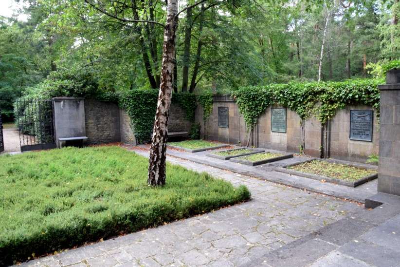 Der Sockel des Obelisken im hinteren Teil des Friedhofs ist als Ehrenhalle gestaltet. |