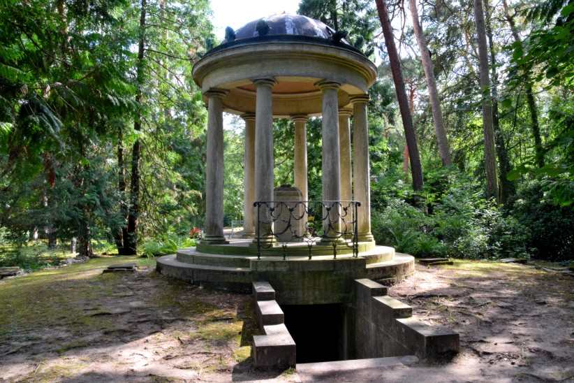 Das Grabmal für den schwedischen Gesandten Hans Henrik Freiherr von Essen (* 1873; † 1923). Vom Eingangstor des "Schwedenblocks" führt der Weg zum Grabmal, das als Gloriette in Form eines Monopteros dem Geländeanstieg folgend die Anlage dominiert. - Glorietten dienen meist nur als Blickfang - |