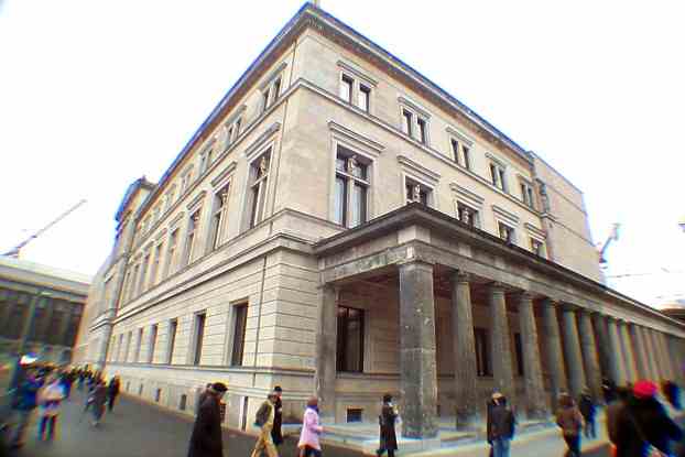 ![]() Hinter den Kolonnaden des Hofes sieht man hier - über die Bodestraße - die Rückseite vom Alten Museum. |