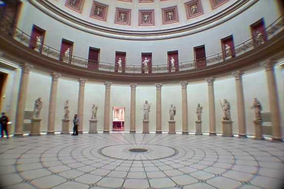 Von außen ist das prächtigste Bauelement des Gebäudes nicht sichtbar. Die Kuppel wurde so geschickt von Schinkel in den Kastenbau des Museums gefügt, dass der Kuppelbau von außen nicht zu erkennen ist. |