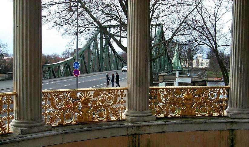 Der Blick durch die Friedenssäulen vor dem Neuen Pavillon (Schinkelpavillon) zum Schloss Charlottenburg.