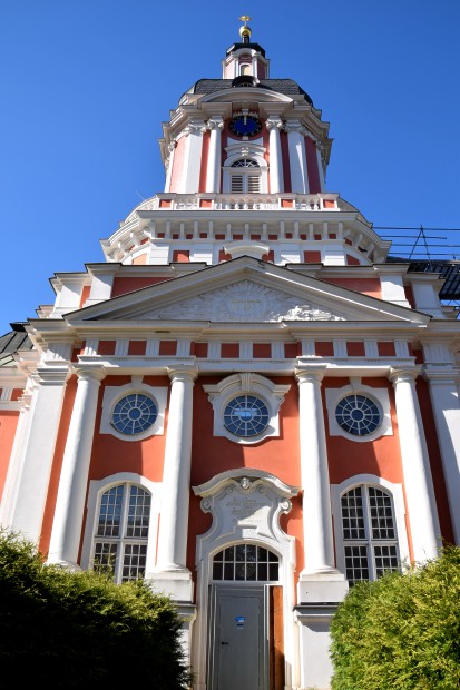 Schlosskirche und Schlosspark Buch im Bezirk Berlin-Pankow. Buch liegt im Norden des Berliner Bezirks Pankow und ist damit der nördlichste Ortsteil Berlins. Der Schlosspark Buch ist eine um 1670 privat angelegte Parkanlage, heute ein Gartendenkmal und Teil des ca. 26,1 Hektar großen Natura-2000-Gebietes, ein zusammenhängendes Netz von Schutzgebieten innerhalb der Europäischen Union, im Berliner Ortsteil Buch, direkt am S-Bahnhof Buch (S2) gelegen. GPS-Position Breitengrad: Längengrad: N 52°38'07.56" , E 13°29'54.44" Der von der Panke durchflossene Park wird vom Nord-Süd-Weg und dem Pankeweg durchquert. Das kleine "Flüsschen" (Nebenfluss der Spree) wird von mehreren kleinen Brücken überspannt. Im Park stand seit 1607 ein Schloss mit Orangerie welches ohne direkte Kriegsschäden geblieben war. Nach dem Zweiten Weltkrieg (1939-1945) zog zwischen 1952 und 1958 zunächst ein (DDR-)Kinderferienheim in die Schlossräume ein. Durch Schwammbefall hatte sich der Zustand des Schlosses jedoch so sehr verschlechtert, dass es 1964 von den DDR-Organen abgerissen wurde. Der Schlosspark und das angrenzende Waldgebiet müssen wegen ihres bemerkenswerten Altbaum- und Totholzbestandes sowie des hohen Grundwasserstandes und dadurch gekennzeichnete Böden - wie Gley-Braunerde und Niedermoor - geschützt werden. Sie sind reich an organischer Bodensubstanz, die häufig auch als Humus bezeichnet wird. Unabhängig von der Nutzung sind alle grundwasserbeeinflussten Böden durch Grundwasserabsenkung gefährdet. Bisher (2023) war der Turmstumpf lediglich mit einem Notdach versehen. Nur die barocke Schlosskirche - hier noch ohne Turm - ist erhalten geblieben, sie steht heute unter Denkmalschutz. Die Schlosskirche wurde 1731 bis 1736 unter der Schirmherrschaft des Bucher Schloss- und Gutsherrn sowie Preußischen Staatsministers und "Protectors der Königlichen Preußischen Societät der Wissenschaften" Adam Otto von Viereck (* 1684; † 1758) errichtet, nach Plänen des Berliner Baudirektors und Architekten Friedrich Wilhelm Diterichs (* 1702; † 1782). Im Zweiten Weltkrieg wurde bei einem Luftangriff auf Berlin am 18. November 1943 durch Bombenabwürfe auch über Berlin-Buch die Schlosskirche von einer Brandbombe getroffen. Sie brannte völlig aus und verlor dadurch auch ihren Turm. Ab 1950 wurde dann im ehem. Ost-Berlin mit dem Wiederaufbau der Schlosskirche begonnen und am 29. März 1953 mit einem Gottesdienst die Kirche wieder geweiht, aber ohne Turmaufsatz. Über dem Portal der Schlosskirche Buch. Die Schlosskirche wurde in den letzten Jahren aufwändig saniert, doch fehlte ihr immer noch der Turm, für dessen Wiederaufbau gesammelt wurde und noch wird. 1962 ist die Schuke-Orgel in der Kirche eingeweiht worden. In den 1980er-Jahren wurde der Fußboden der Kirche aufgenommen und eine neue Heizung installiert. Im Jahr 2000 sind die Arbeiten zur Sanierung der Außenhülle der Schlosskirche abgeschlossen worden.