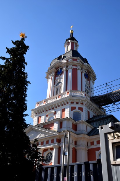 Foto: Februar 2024. Die Kuppel (links vorne) mit der geschwungenen Haube und der achteckigen Laterne wird separat erstellt und später dann auf den Glockenturm aufgesetzt, wie weiter unten im Foto geschehen. |