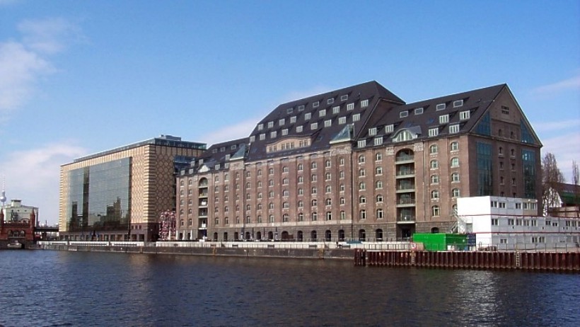 Die restaurierten und umgebauten Spreespeicher an der Oberbaumbrücke, der landeseigenen Hafengesellschaft Behala. Die alten Speichergebäude des Osthafens an der Oberbaumbrücke sind ein bedeutendes Denkmal der Industriearchitektur des beginnenden 20. Jahrhunderts. Diese Gebäude hatte Stadtbaurat Friedrich Krause (* 1856; † 1925) auf dem Gelände an der Stralauer Allee von 1907 bis 1913 zu einer Hafenanlage gestalten lassen. ![]() Der auffällige Getreidespeicher (rechts) und das später von Oskar Pusch (* 1877; † 1970) hinzugefügte Eierkühlhaus (links) an der Oberbaumbrücke (1928-29) wurden nach dem Mauerfall (1989) saniert und für ihre künftige Nutzung als Bürogebäude umgebaut. Das Friedrichshainer Spreeufer hat mit dem Osthafen einen der schönsten Flusszugänge, die sich im Stadtgebiet finden lassen. Die Umnutzung der Osthafen-Speicher ist nur ein erster Schritt zur Wiederbelebung des Friedrichshainer Spreeufers. Restaurants, mit gemütlichen Liegestühlen an der Hafenmauer, sind schon vorhanden. Hier ist unter anderen die Universal Music mit ihrem Firmensitz etabliert und auch der Musik-Sender MTV hat sich in einer 120 Meter langen Halle auf 2500 Quadratmeter mit seinen Studios und Büros eingerichtet (Mai 2004).